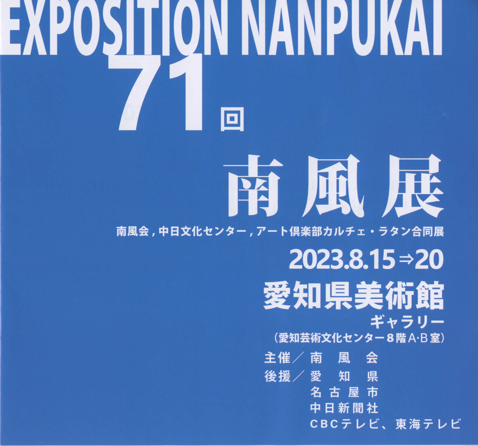 第71回 南風展 2023年8月19日 最終更新日時 : 2023年8月20日 とりちょん 2023年8月16日から第71回南風展が開催しています。台風7号で公共交通機関が運休となり止む無く8月15日は中止となり、16日からの開催となりました。 南風展は2010年に亡くなりました小川博史 先生が作られました南風会の展覧会です。今は小川先生のご子息の武部志摩子さんが引継ぎ開催されています。 出展者は南風会の方以外、中日文化センターとアート倶楽部カルチェラタンの生徒の方々が出展されています。 開期 8/16-8/20、場所 愛知県美術館8階 青山誠一先生の作品 鳥居秀樹さんの作品